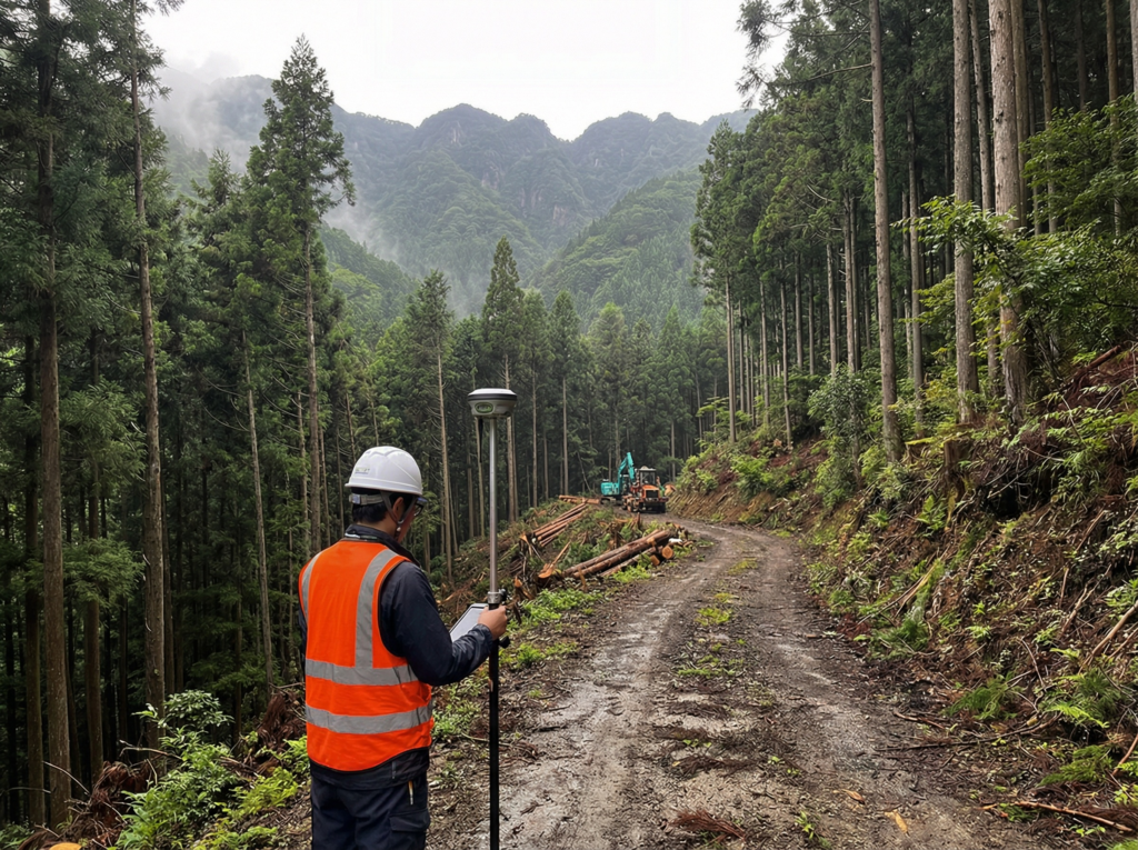 林道開設や森林作業に必要な地形データを、ドローンレーザ計測とRTK-GNSSで高精度取得。