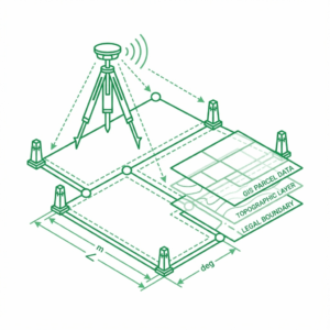 RTK-GNSS(誤差数cm)による高精度計測で、土地境界明確化、現況測量、図面作成に対応。土地家屋調査士と連携し、登記申請までサポート。